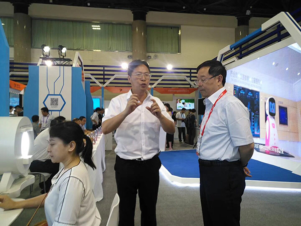 董事長王聯向工信部副部長張克勤介紹公司的中醫綜合診斷系統,中醫醫聯體及中醫機器人在全國基層醫療和養老方面的應用情況。